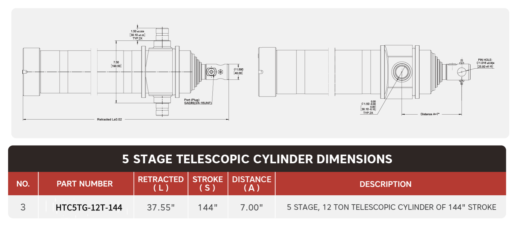 „HTC5TG-12T-144“, 5-stufiger Teleskopzylinder mit 12 Tonnen und 144-Zoll-Hub