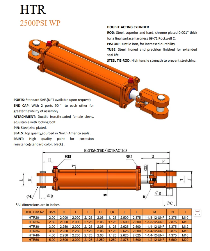 Dieser geschweißte HCIC-Standard-Gabelkopfzylinder hat eine Bohrung von 4 Zoll, einen Hub von 36 Zoll und eine Stange mit einem Durchmesser von 2 Zoll. Doppeltwirkend SAE 8 (-08) ORB(F) Arbeitsanschlüsse 2.500 PSI maximaler Arbeitsdruck Gabelkopfhalterungen 1-Zoll-Befestigungsstifte im Lieferumfang enthalten Die glänzende schwarze Farbe ist langlebig und lichtbeständig